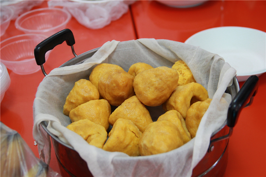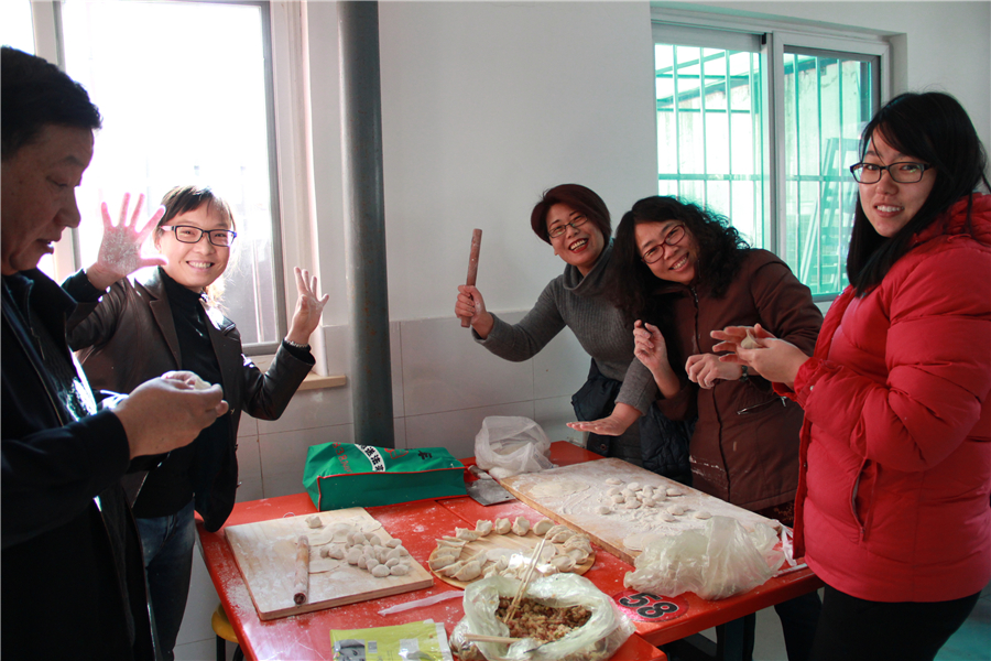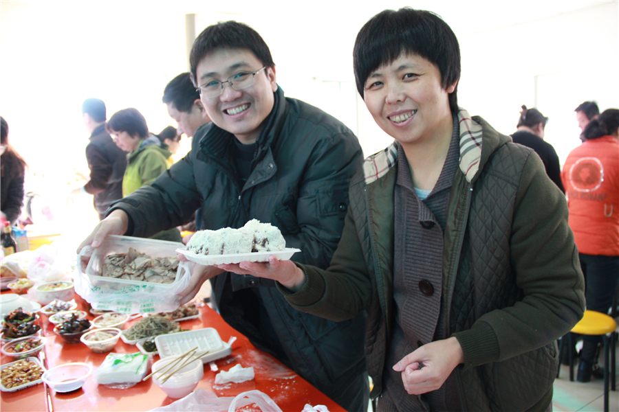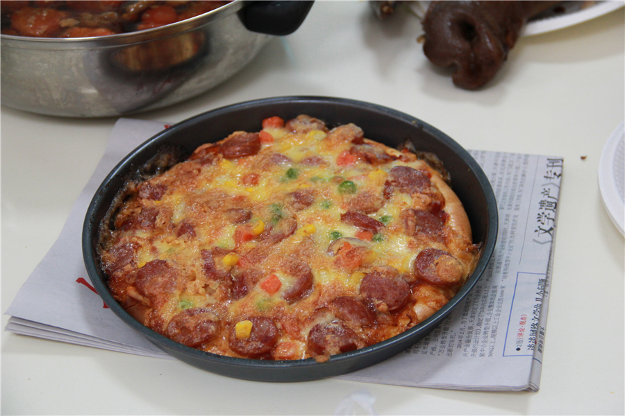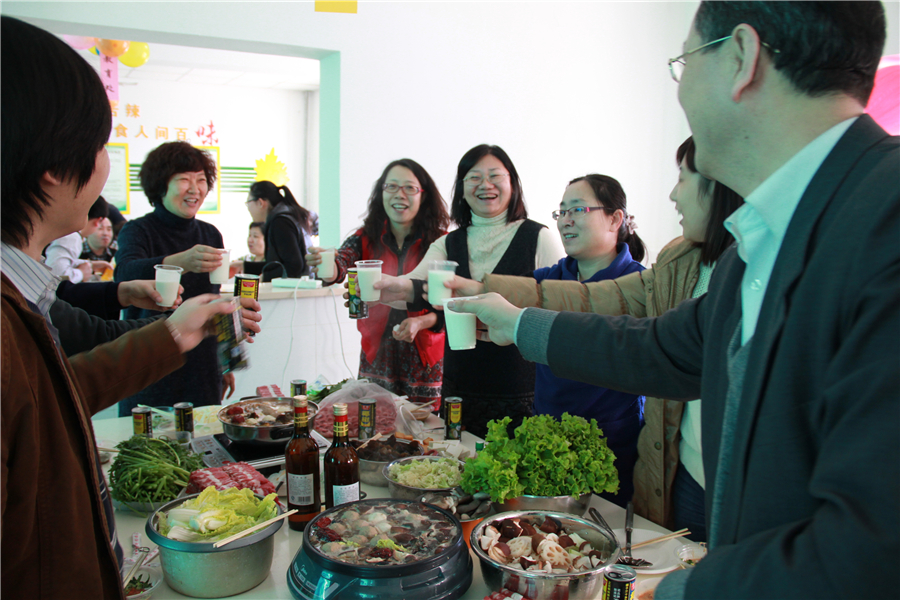 中午11点30,老师们准时到达了学校餐厅,几张桌子一并,立马变出了各种各样的好吃的,有人炖了一大锅排骨,也有人做了大个儿的酱肘子,有做了酥鱼,有人做了雪白的馒头,有人蒸了锅金黄的窝头儿,李校长最厉害,自己动手,做了一个比萨(还没等开席,就少了一块儿)。也有省事儿组买了带冻饺子,当然也有人买了各种菜准备涮火锅,各组不尽相同,一时间餐厅里人声鼎沸,四处飘香。每从一张桌前走过,就有老师热情的拉住你,让你品尝自己做的菜,只为了让人叫一声好!那可是一件倍儿有面子的事儿啊。