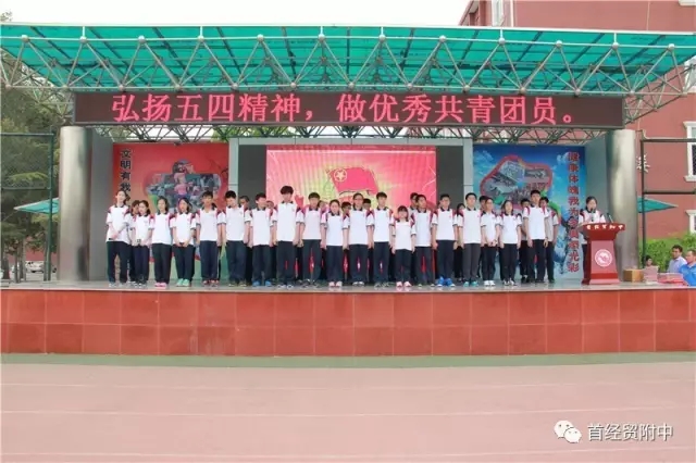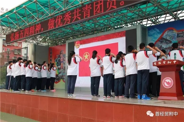 5月8日上午,首经贸附中团委在操场隆重举行了2017年度共青团五四表彰大会,表彰学校一年来涌现出的优秀团员干部,优秀团员,优秀少年队员干部及优秀的少先队员,大会还为新团员举行了入团宣誓仪式。校长李晨辉、校党总支书记刘淑玲书记,李智勇副校长、工会主席孟繁利等校领导出席了表彰会并为受表彰的团员,少年队员等进行颁奖。